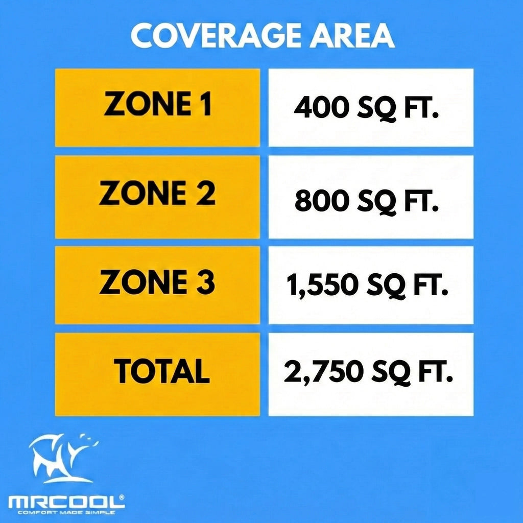 Heat or cool three zones with the MRCOOL DIY Multi-Zone 55,000 BTU 22 SEER2 3 Zone Ductless Heat Pump Split System – 9k + 18k + 36k. This DIY Series multi-zone product features easy installation that requires no special tools or training. You'll save thousands of dollars on installation and you can get the amazing air comfort of your dreams due to the condenser’s 55,000 BTU capacity.