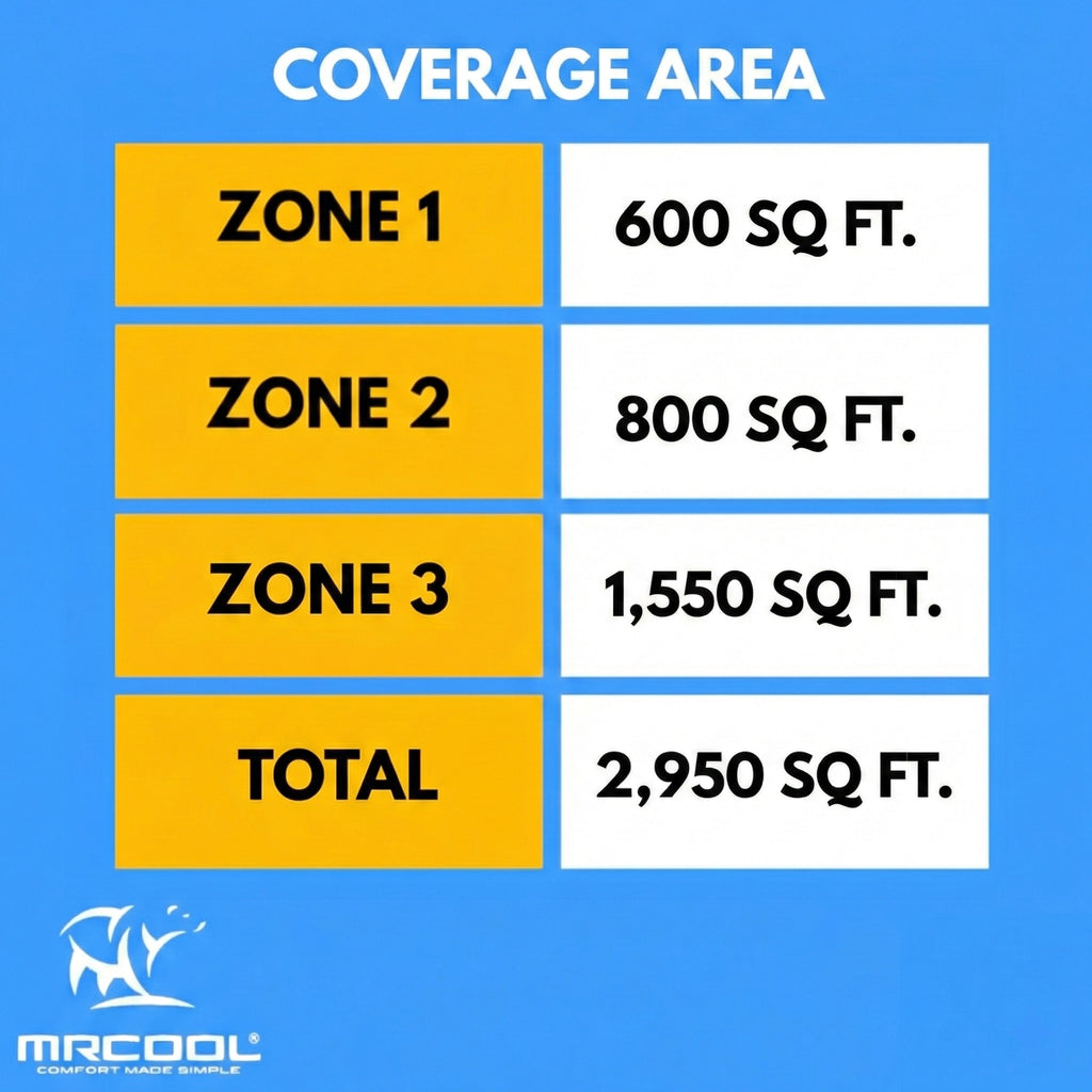 Heat or cool three rooms with the MRCOOL DIY Multi-Zone 48,000 BTU 21.8 SEER2 3 Zone Ductless Heat Pump Split System - 12K + 18K + 36K. This DIY Series multi-zone product features easy installation that requires no special tools or training. You'll save thousands of dollars on installation and you can get the amazing air comfort of your dreams due to the condenser’s 48,000 BTU capacity. This units consists of two 12,000 btu air handlers (550 square feet) and one 18,000 btu (800 square feet). A heat pump by design, this ductless HVAC solution can run in reverse and pull in heat from the outdoors when in a heating mode. It comes with a 7 year compressor warranty, (Plus a limited lifetime compressor warranty), 5 year parts manufacturer warranty!